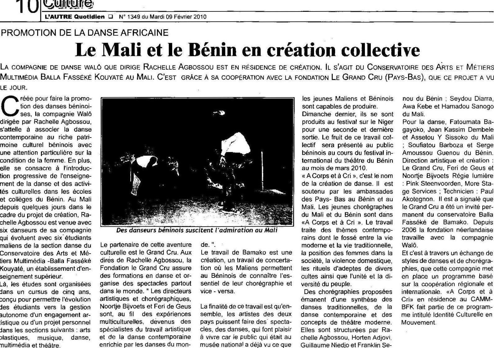 Identité Culturelle and Mouvement is a training program by Le Grand Cru focused on regional exchange of dance traditions and strengthening of regional cultural networks. The training included the exchange and learning of traditional dance techniques from Benin and Mali, modern dance techniques and artistic guidance and coaching of young artists in a choreographed program. This young makers program presented three choreographers from Benin and three from Mali. Each choreographer worked several weeks with between two to eight dancers. “A Corps et A Cri” was presented at the Musée National de Bamako as a preview during the composition phase and two nights of the program.
