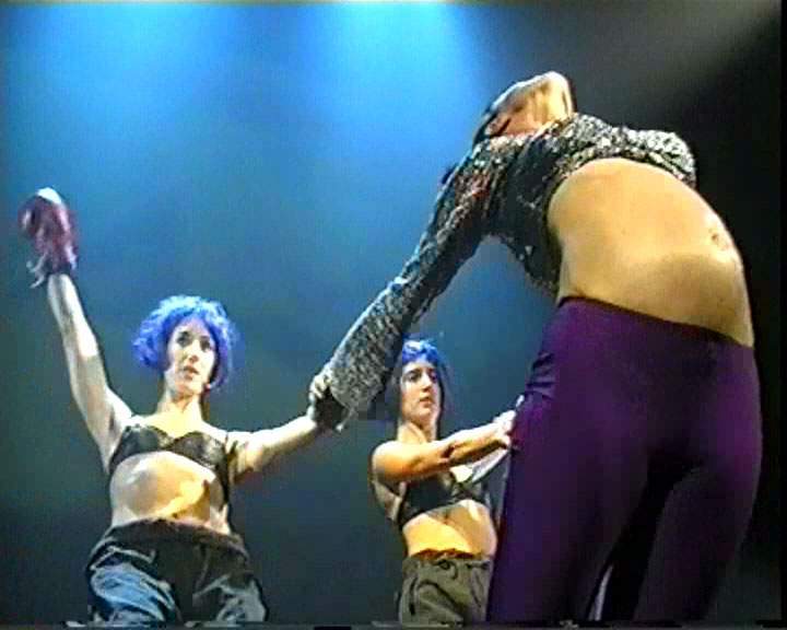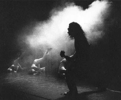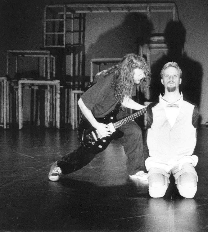 Feri de Geus worked closely together with composer Stefan van Campenhout, creating eloquent live music productions until Stefan’s tragic disappearance in the Swiss Alps in 1993. In 1996, he was invited to create a dance piece Covered in collaboration with a pop group called Nerve. Their heavy metal sound was an ultimate challenge. Together with five dancers, Phil Mills and Tom Holkenberg (world-famous as Junkie XL) were easily integrated into a stunning performance, which was both presented in music halls and theatres. The piece was based on a number of case studies dealing with cocaine addicts. The ludicrous attitudes and freakish, unpredictable movements of the characters coincided with the loud undulations of the techno metal band in a wadded set designed by Sjoerd Wagenaar.